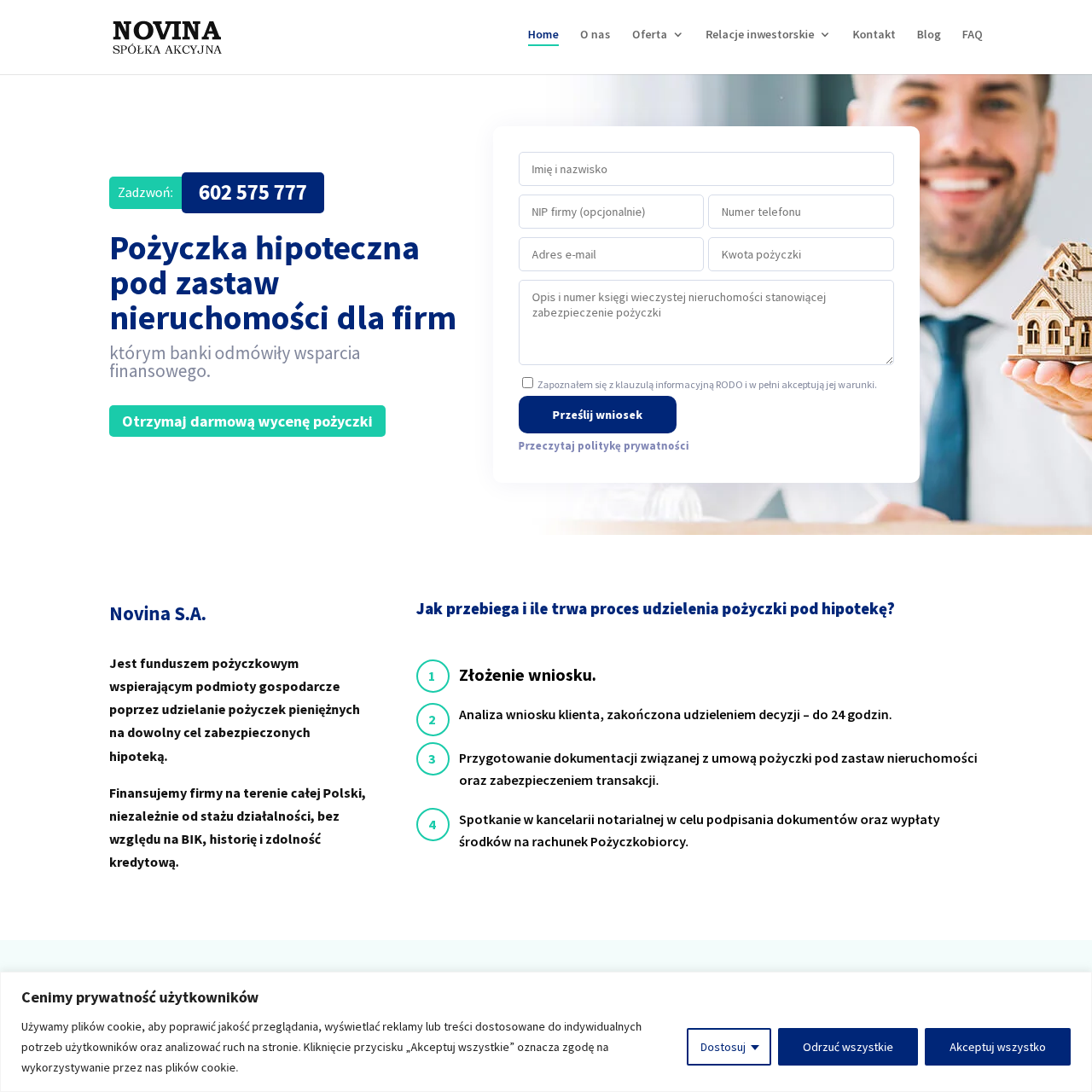 Novina S.A. to niezawodne wsparcie finansowe dla Twojej firmy, zabezpieczone nieruchomością. Jesteśmy funduszem pożyczkowym, który specjalizuje się w udzielaniu pożyczek hipotecznych dla przedsiębiorców. Doskonale zdajemy sobie sprawę z wyzwań, przed jakimi staje wielu z Was. Dlatego właśnie oferujemy elastyczne rozwiązania finansowe, które pomagają nawet wtedy, gdy banki mówią „nie”. Nasza misja? Po prostu wspierać rozwój polskiego biznesu, zapewniając szybki i łatwo dostępny kapitał.